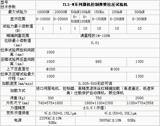 產(chǎn)品概述: TLS-WI系列微機控制拉壓彈簧試驗機依據(jù)JB/T7796-2005《拉壓彈簧試驗機技術(shù)條件》規(guī)定的技術(shù)要求制成。該型拉壓彈簧試驗機主要用 于測試各種螺旋彈簧及彈性元件的強度,即在一定的變形量(或高度)下測試彈簧的試驗力或在一定的試驗力下測定彈簧的高度或變形量。 功能特點: 本機主要適用于各種彈簧的強度試驗、力學(xué)性能及工序能力分析。 本機軟件包有速度控制、參數(shù)輸入、數(shù)據(jù)處理、結(jié)果觀察、圖表顯示、圖表打印、數(shù)據(jù)保存等功能模塊組成。 試驗方式多樣化,地彈簧試驗機,可以設(shè)置彈簧的試驗力,檢測彈簧的剩余高度或變形量;也可以設(shè)置彈簧的剩余高度或變形量,檢測試驗力等功能。 多點自動變速采集數(shù)據(jù),并自動返回到初始位置,1噸彈簧疲勞試驗機,整個試驗過程自動化。 過載自動返回,彈簧壓力機,以保護(hù)傳感器不受損壞。 具有強大的數(shù)據(jù)處理及數(shù)據(jù)統(tǒng)計功能,繪制剛度曲線、計算彈簧的分段剛度,可以進(jìn)行數(shù)據(jù)統(tǒng)計,繪制正態(tài)分布圖、計算工序能力指數(shù)。采用數(shù)控電機調(diào)速系 統(tǒng)或進(jìn)口交流伺服電機及調(diào)速器和精密滾珠絲杠副組成傳動系統(tǒng),與高精度負(fù)荷傳感器、位移傳感器及數(shù)字式數(shù)據(jù)采集卡、PC組成測控系統(tǒng),實現(xiàn)了穩(wěn)定可靠運行 及精確測量。 技術(shù)參數(shù): ![]() ![]()