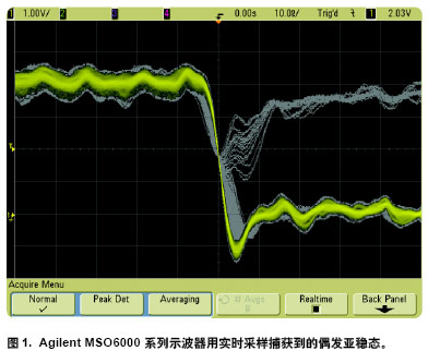 圖1 是用 Agilent's 6000 系列示波器捕獲到的毛刺該示波器甚至能在帶sin(x)/x重建時用實時采樣達到100,000 次/ 秒的波形更新。在這一更新率下示波器捕獲到該特用實時采樣捕獲亞穩(wěn)態(tài)定信號的統(tǒng)計概率約為每秒二次。采用專有MegaZoom III 技術(shù)的Agilent示波器實現(xiàn)了這一業(yè)內(nèi)領(lǐng)先的更新率。