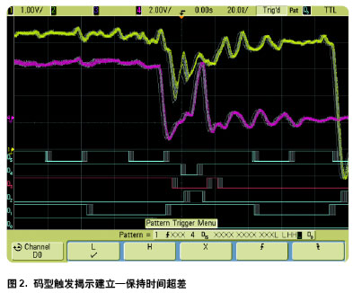 一旦我們發(fā)現(xiàn)電路存在非預期的行為就可開始進一步調(diào)試我們的系統(tǒng)。使用混合信號示波器(MSO)的邏輯通道就能設(shè)置跨多個模擬和數(shù)字通道的組合邏輯碼型觸發(fā)條件。它揭示由于時鐘抖動我們的系統(tǒng)偶爾出現(xiàn)對建立 保持時間指標的超差如圖2 所示。